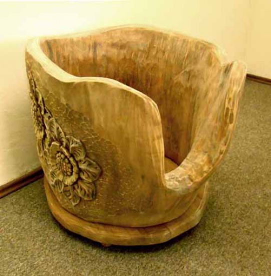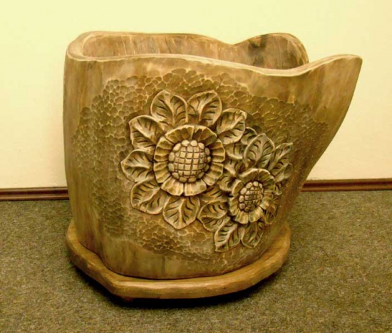 Oryginalny kwietnik – donica, ręcznie wycięta z pnia, dekorowana rzeźbionym motywem słoneczników i barwiona. Przedmiot unikatowy, ze względu ręczną obróbkę, a także wykorzystanie tak niepowtarzalnego materiału, jakim jest drewno w pniu.
