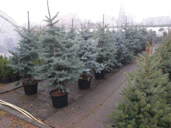 Szkółka Betula oferuje żywe choinki w donicach.